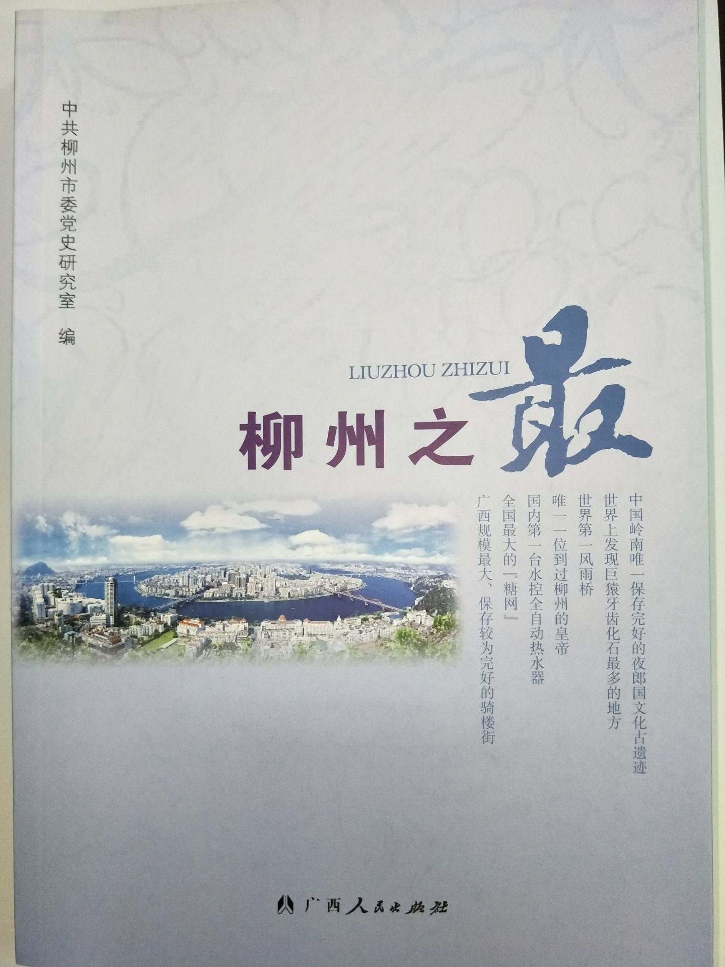 《柳州之最》该书按内容共分历史遗珍、名胜奇观、天文地理、特产奇珍、社会政治、工业企业、财贸金融、城市建设、交通运输、邮电通信、农林畜牧、军事军工、公安政法、医药卫生、科学技术、教育人才、文化艺术、体育娱乐十八大类。每一大类中的条目原则上按时间顺序辑录排列,其辑录标准均为在柳州或者广西、全国乃至世界占“之最”地位的事、物和人。中共柳州市委书记陈刚为该书作序。全书40多万字,分为十八个大类,共收录条目1000余条,内容上溯柳州上古时代,下迄2011年11月时,重点记述新中国成立以后,特别是改革开放以来柳州市各行各业涌现的“之最”,全面地反映了柳州市各行各业所取得的辉煌业绩。